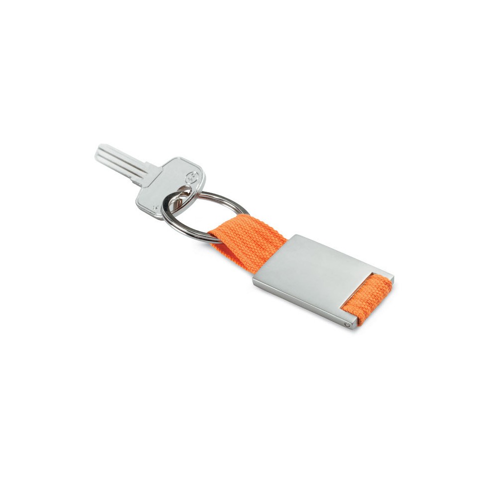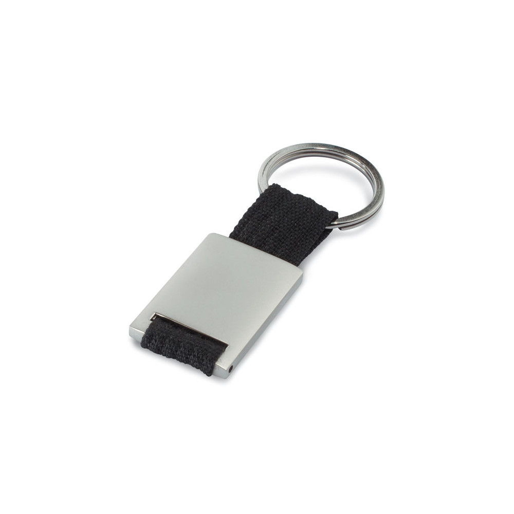 Prostokątny brelok ze stopu cynku i z kolorową plecioną taśmą z polyestru. Indywidualnie pakowany w czarne kartonowe pudełko.