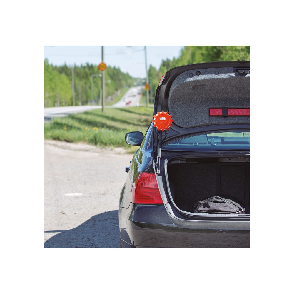 Światło 5 LED, tryby świecenia: światło stałe, tylko góra, obrotowe, migające i błyskające. Włącznik i wyłącznik. Częściowo gumowana i przezroczysta obudowa z magnesem i składanymi hakami na dole. Nie zawiera baterii (3x AAA).