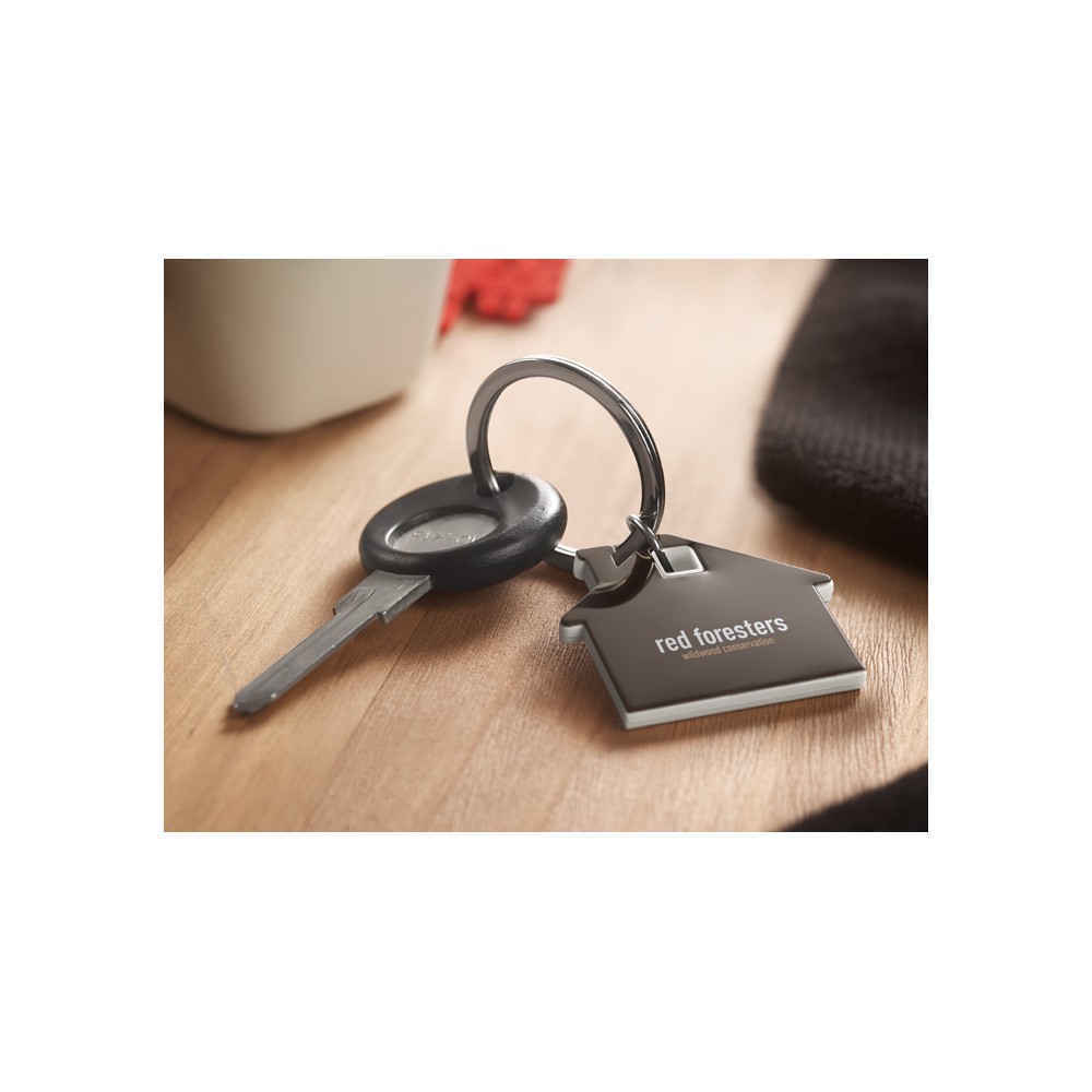 Brelok na klucze w kształcie domku, wykonany ze stali nierdzewnej oraz ABS.