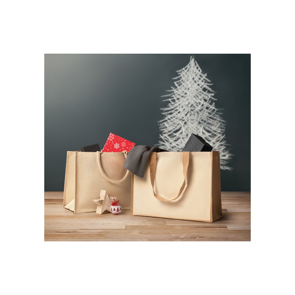 Jutowa torba na zakupy, wewnątrz laminowana, z zewnątrz płócienna. Posiada długie, bawełniane uchwyty.