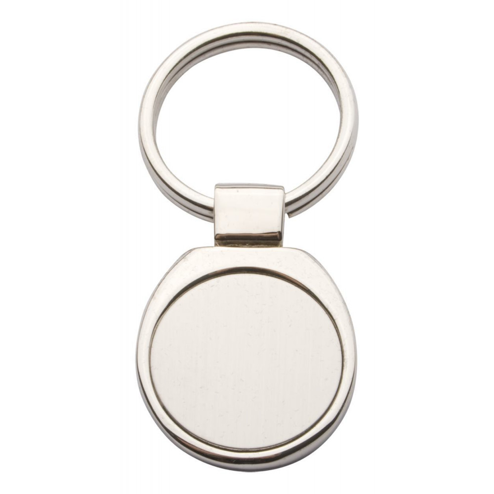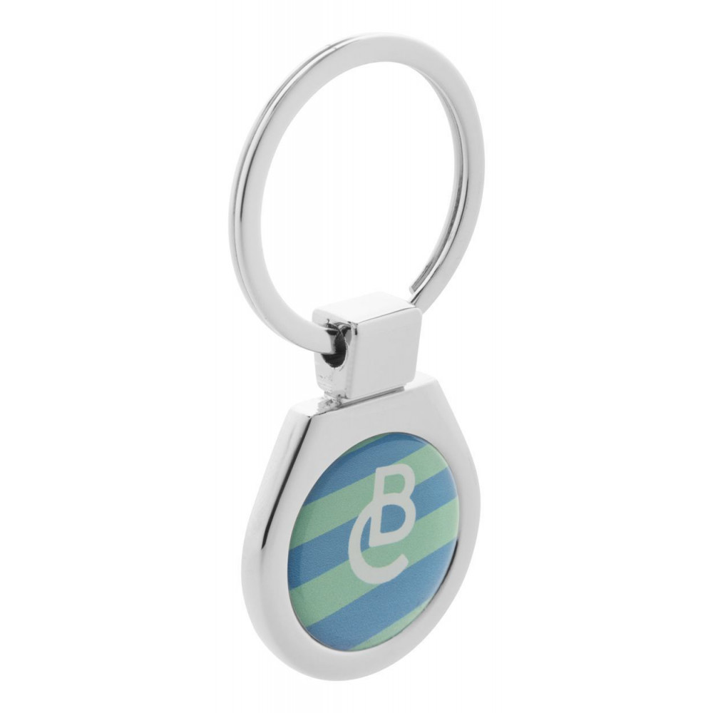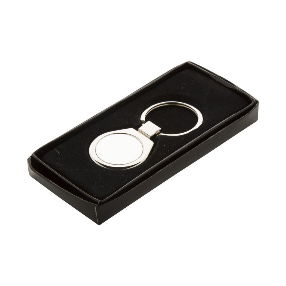 Metalowy breloczek do kluczy w czarnym pudełku.