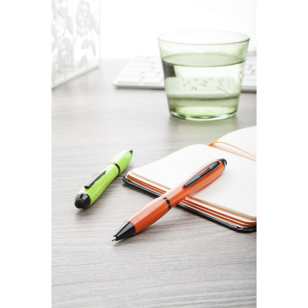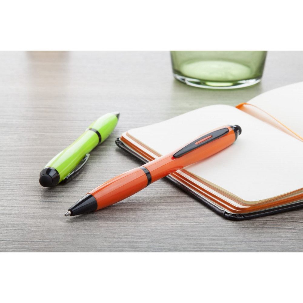 Plastikowy długopis z końcówką do ekranów dotykowych, kolorowym korpusem i uchwytem oraz czarnymi częściami. Zawiera niebieski wkład.