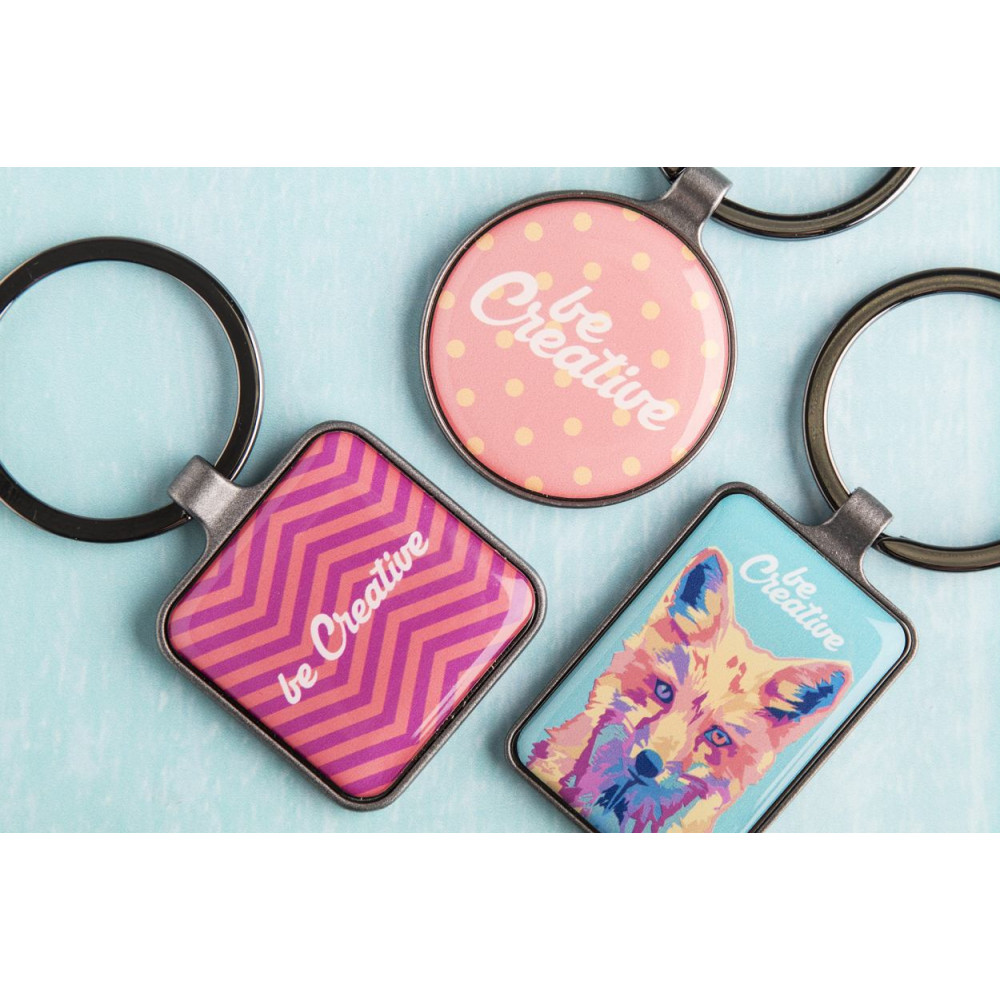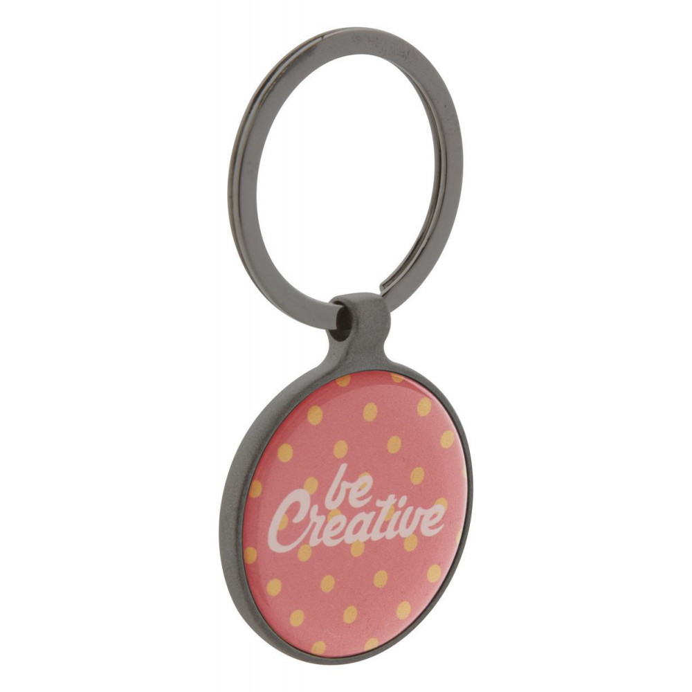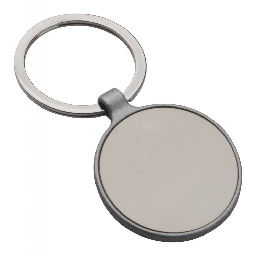 Okrągły, metalowy brelok z metalicznym wykończeniem.