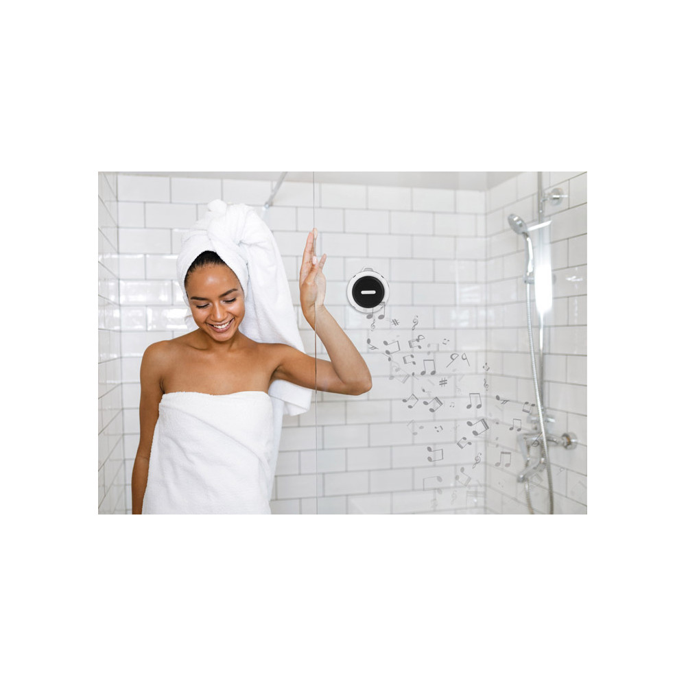 Mały głośnik z przyssawką posiadający klasę wodoszczelności IPX4, czyli całkowitą ochronę przed spryskiwaniem i zachlapaniem wodą z różnych kierunków z natężeniem do 10 litrów na minutę. Świetnie nadaje się do użytku turystycznego i na co dzień np. przy lekkim deszczu. Możliwość wykorzystania głośnika jako zestawu głośnomówiącego. Odtwarzanie muzyki jest możliwe za pośrednictwem bluetooth (wersja 4.2) lub karty micro SD. W zestawie kabel do ładowania z końcówką micro USB i karabińczyk. Posiada metalową płytkę przeznaczoną do wykonania znakowania. Produkt jest zgodny z odpowiednimi dyrektywami Unii Europejskiej oraz posiada znak CE. Dane techniczne: Moc wyjściowa: 3W x 1 Napięcie: 5V Stosunek S/N: ≥ 70 dB, czas pracy: 1-1,5 godziny, pojemność baterii 300mAh