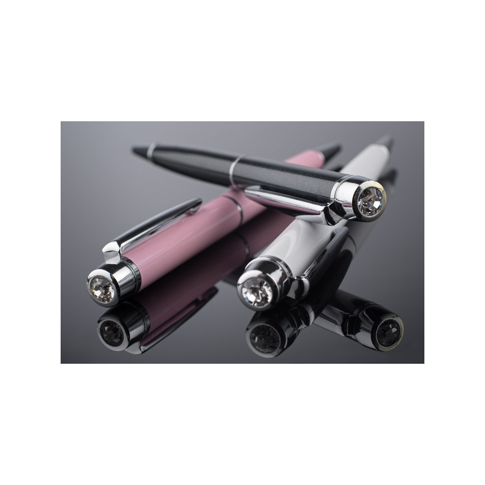 Długopis CAMINI to propozycja dla kobiet lubiących, aby praktyczne przedmioty były także pełne uroku i wyróżniały się czymś wyjątkowym. Ten klasyczny długopis wykonany jest z metalu pokrytego specjalną farbą o perłowym odcieniu i ozdobiony szklanym oczkiem imitującym cyrkonię. Mechanizm włączający typu twist. Metalowy wkład typu cross o grubości 1.0 mm w kolorze niebieskim.