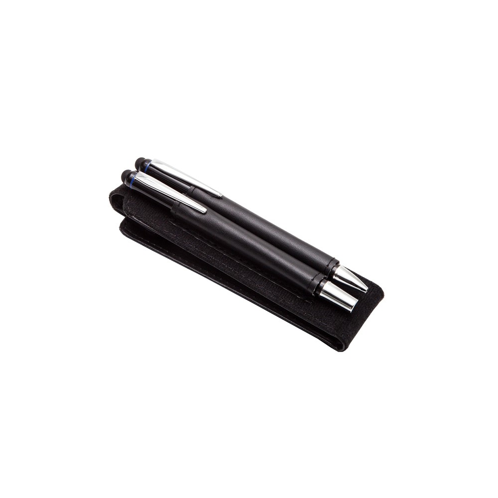Zestaw składający się z aluminiowego długopisu i pióra kulkowego wyposażonych w końcówkę do obsługi ekranów dotykowych, w etui z ekoskóry. Chromowane dodatki. Wkład do długopisu o średnicy 1,00 mm w kolorze niebieskim, nabój o średnicy 0,7 mm do pióra kulkowego także w kolorze niebieskim. Pakowany w czarne opakowanie upominkowe.