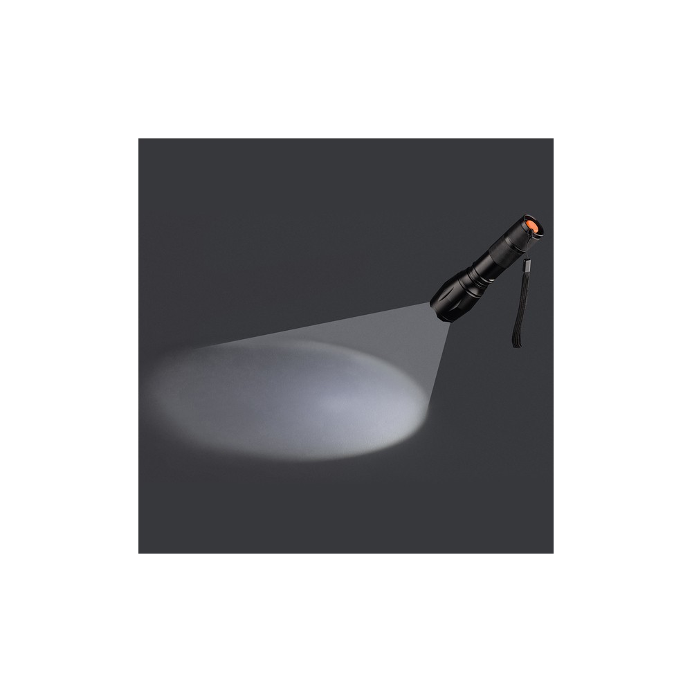 Latarka LED o strumieniu światła 200 lumenów, wyposażona w diodę CREE T6 (3Wat). Trzy tryby świecenia: mocny, oszczędzający, migający. Funkcja zoom. Zasilana 3 bateriami AAA (dołączone). Zasięg 50 m, żywotność diody LED 100000 godz. Pakowana w czarne etui z poliestru.