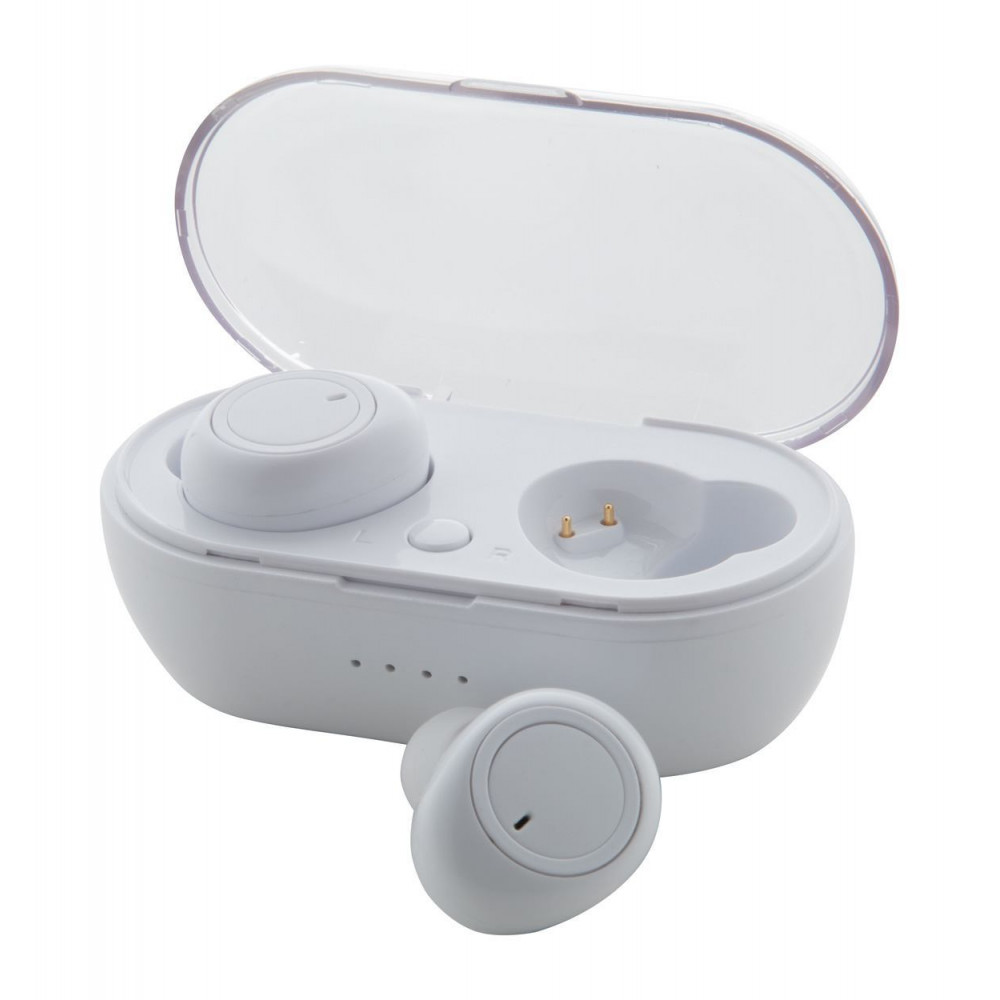Bezprzewodowe słuchawki bluetooth z funkcją rozmów głosowych. W Plastikowym etui ładującym. Zestaw zawiera kabel USB do ładowania.