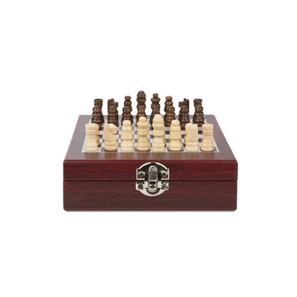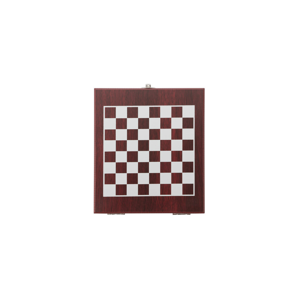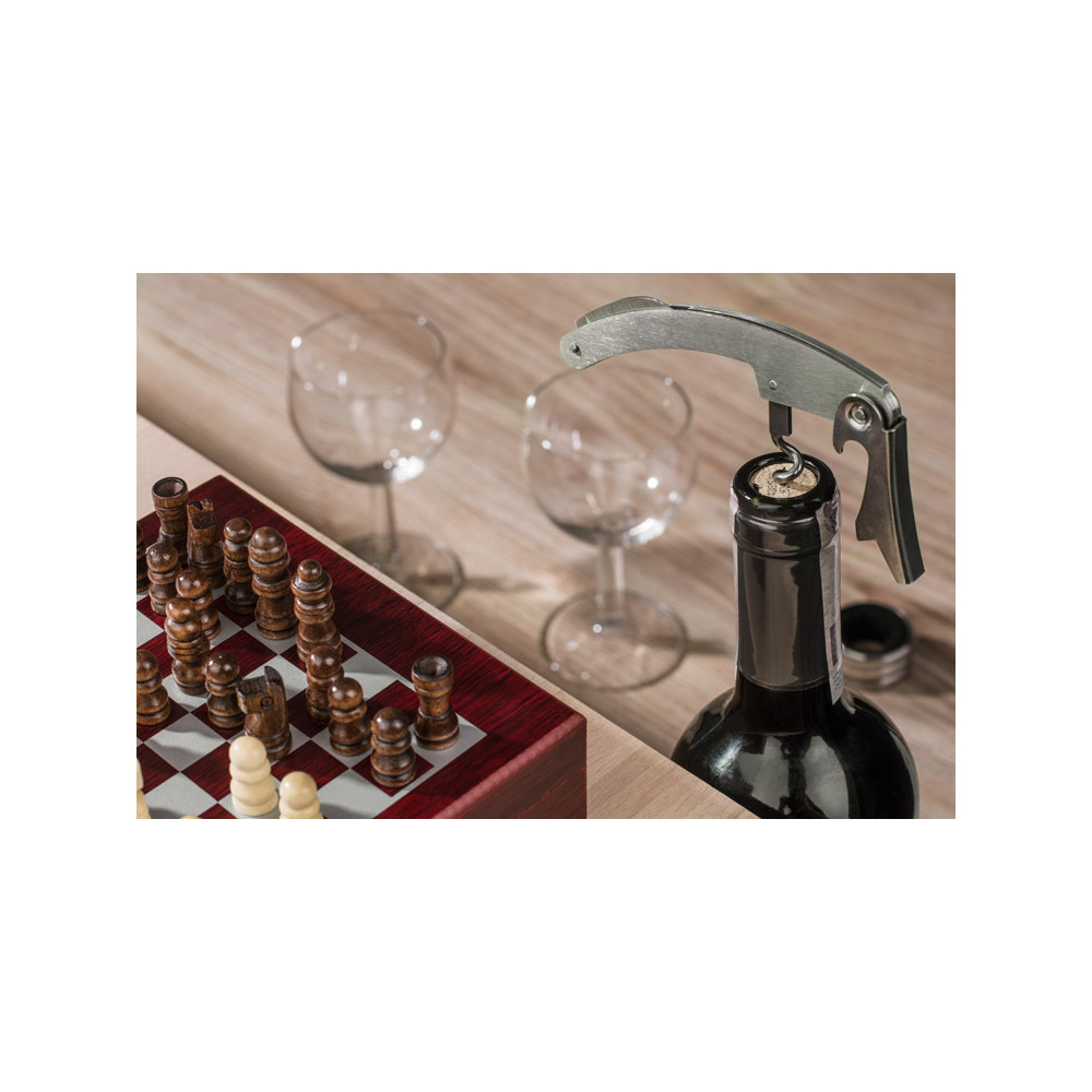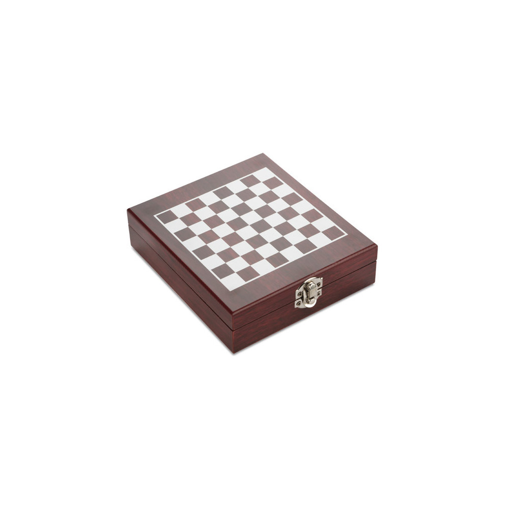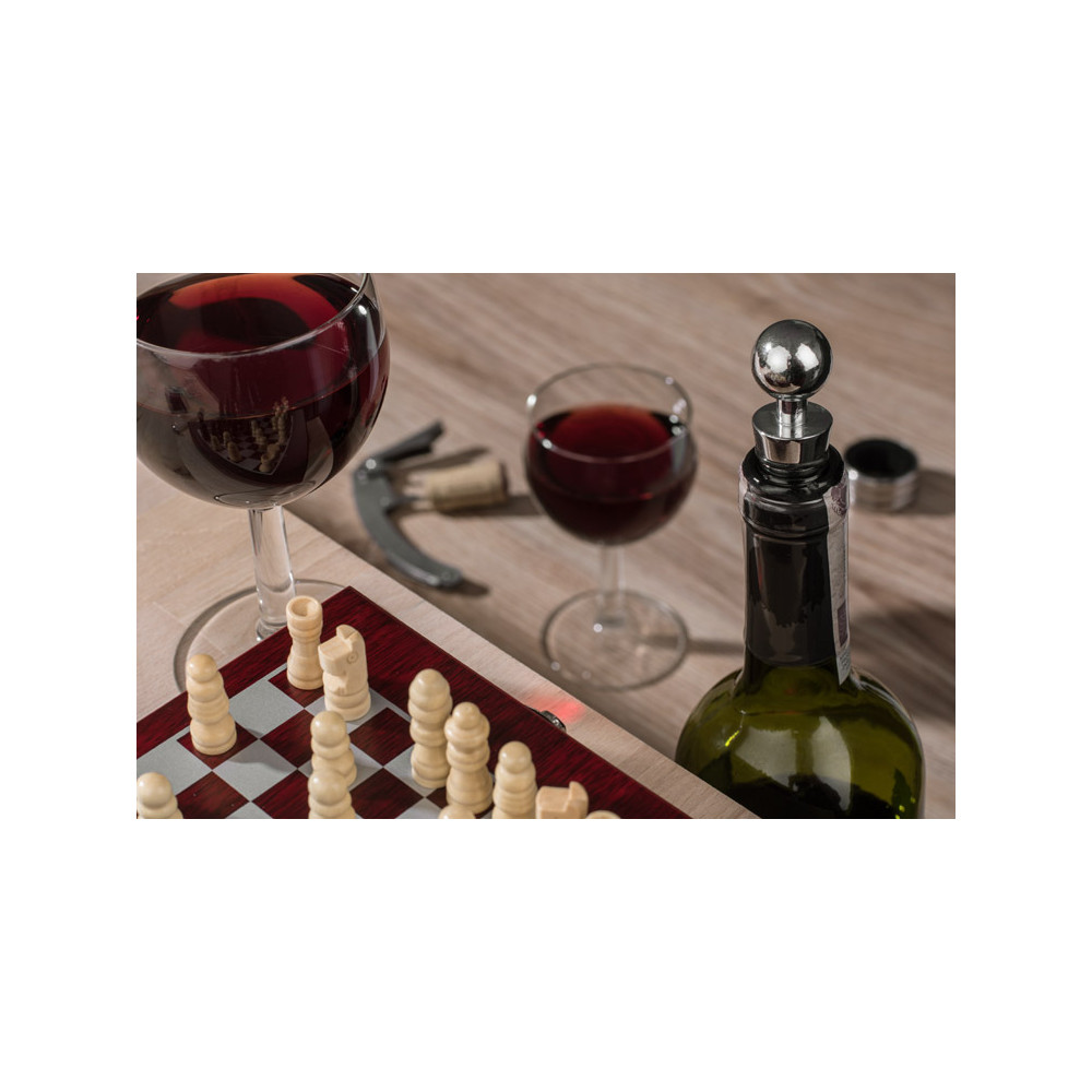 Komplet do wina zawierający 4 elementy: nóż kelnerski, termometr, zatyczkę oraz opaskę na szyjkę butelki. Dodatkowo posiada komplet szachów. Planszę do gry tworzy się poprzez rozłożenie drewnianego pudełka. Szachy wykonane są z drewna. Logo grawerujemy na pudełku.