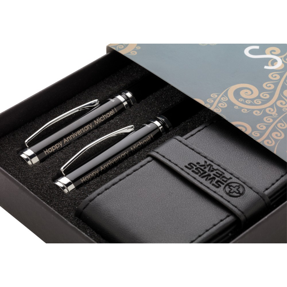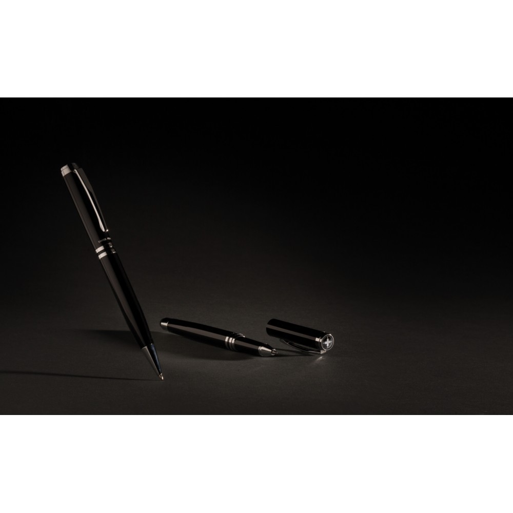 Ekskluzywny zestaw piśmienny, połączenie najwyższej jakości i klasy. Zestaw zawiera wysokiej jakości, wykonane z mosiądzu, ciężkie pióro kulkowe z touch penem i długopis z logotypem Swiss Peak, wkład niebieski. Pokrowiec PU oraz opakowanie podarunkowe w komplecie.