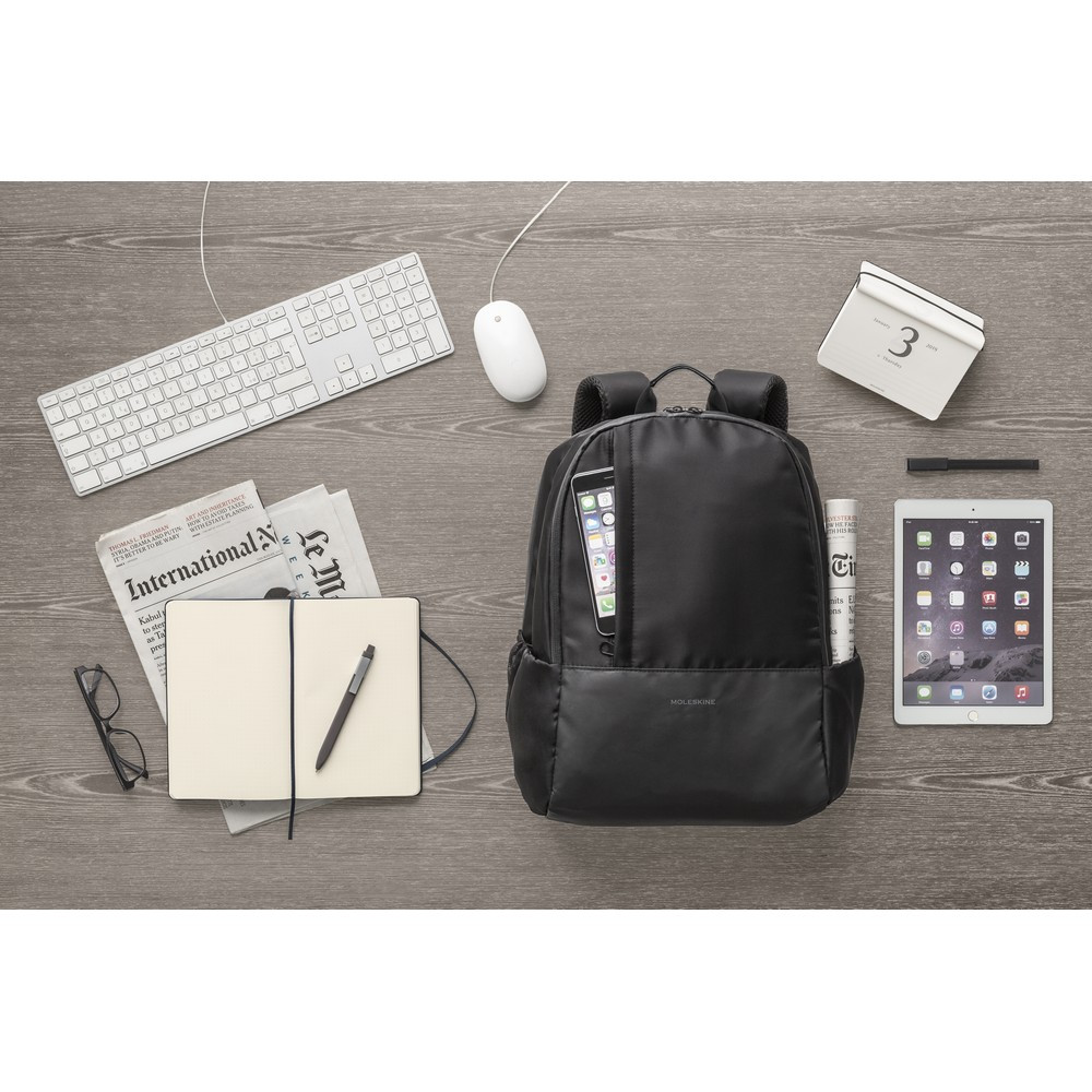 Plecak na laptopa 15" MOLESKINE Business, przegroda główna oraz 2 kieszenie przednie na zamek błyskawiczny, średnia kieszeń z licznymi przegródkami, przegroda główna z miękką przegrodą na laptopa oraz na tablet i miejscami na przybory do pisania, pasek do zamocowania na torbie podróżnej, kieszeń na zamek błyskawiczny na plecach, miękkie plecy i paski na ramię, 2 kieszenie boczne
