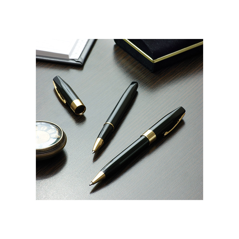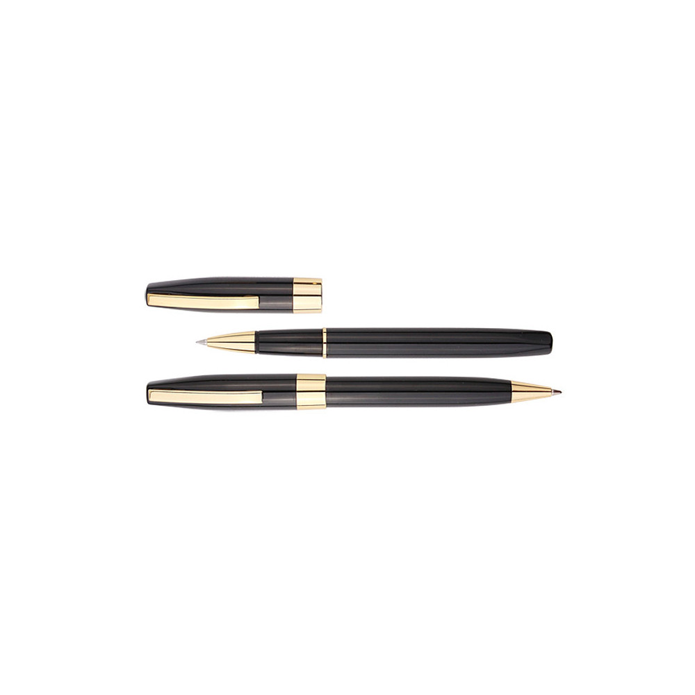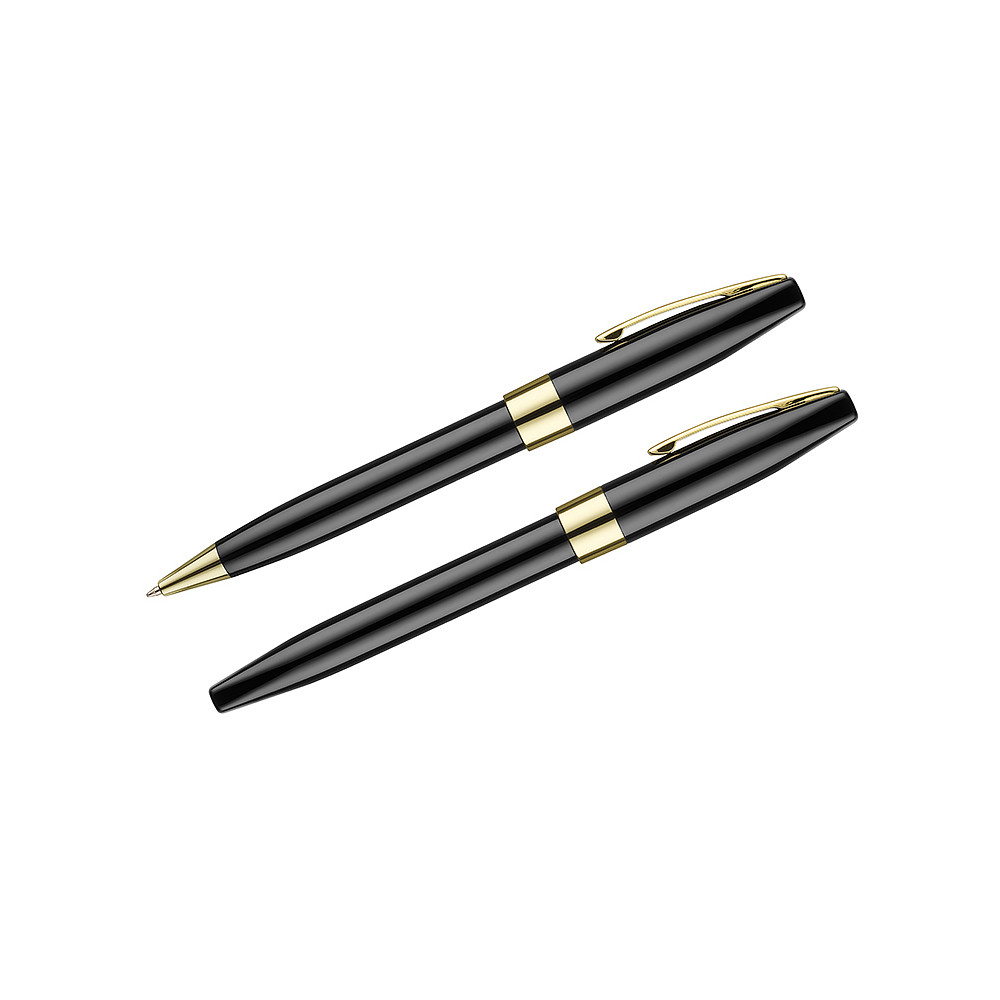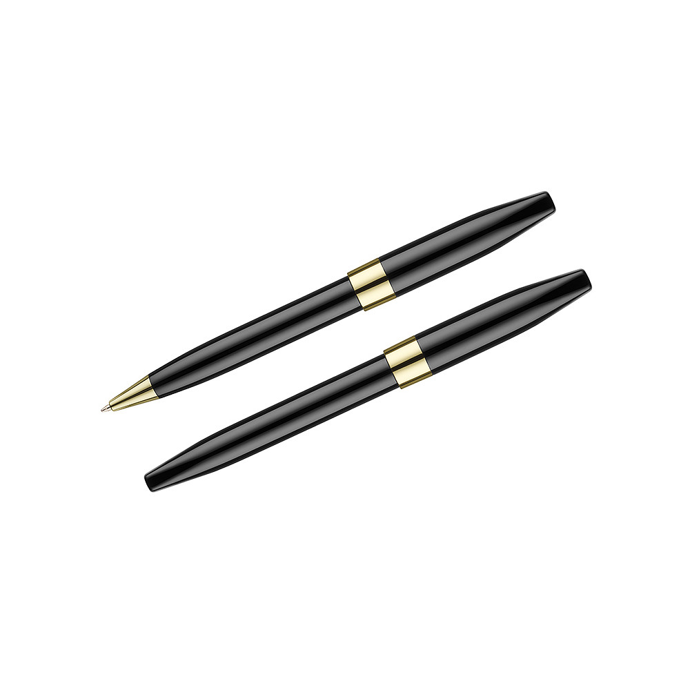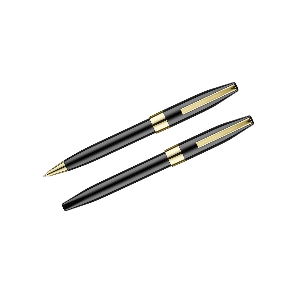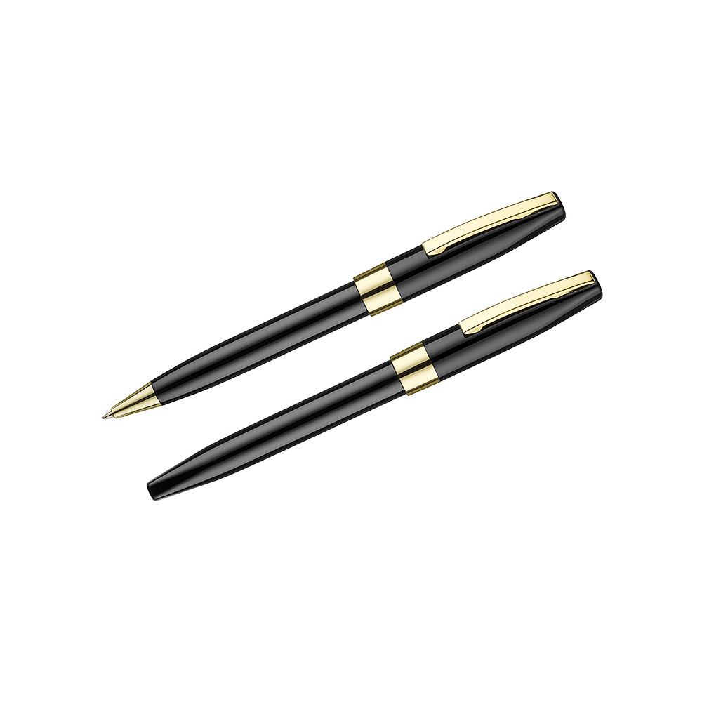 Komplet piśmienniczy ze złotymi wykończeniami pakowany w etui wykonane z eleganckiego czarnego weluru. W komplecie znajduje się długopis oraz pióro kulkowe. Logo wygrawerujemy w kolorze złotym na długopisie i piórze kulkowym w ich górnej części.