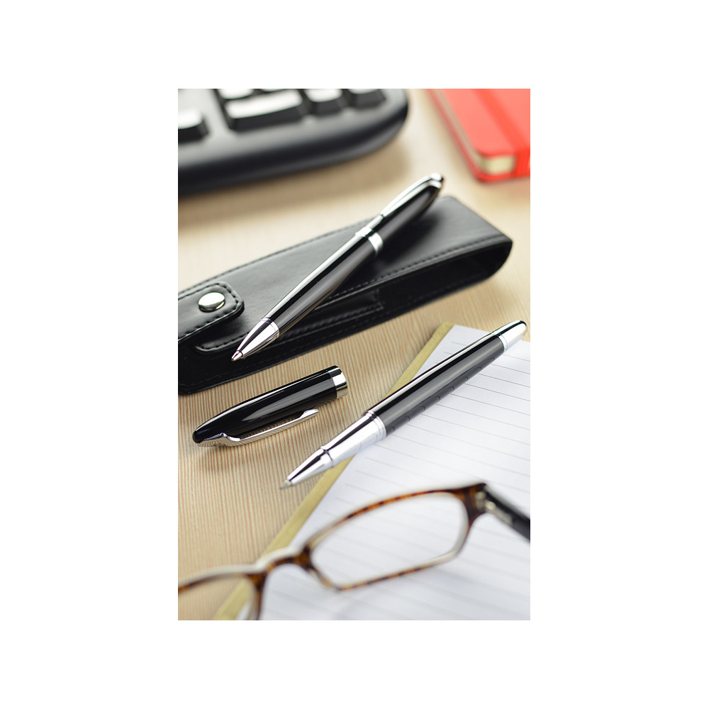 Elegancki zestaw piśmienniczy składający się z długopisu i pióra kulkowego. Zapakowany jest w etui wykonanym z ekoskóry PU. Grawer logo możemy wykonać na artykułach piśmienniczych.