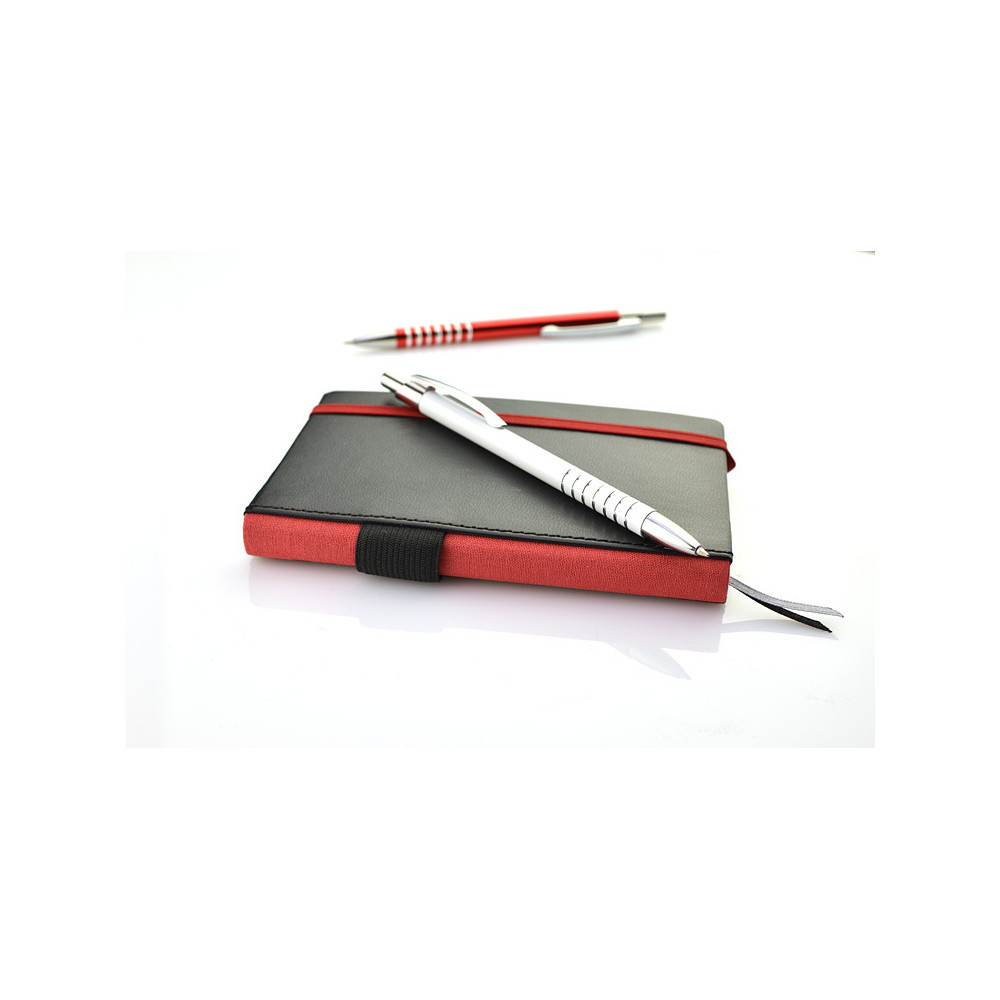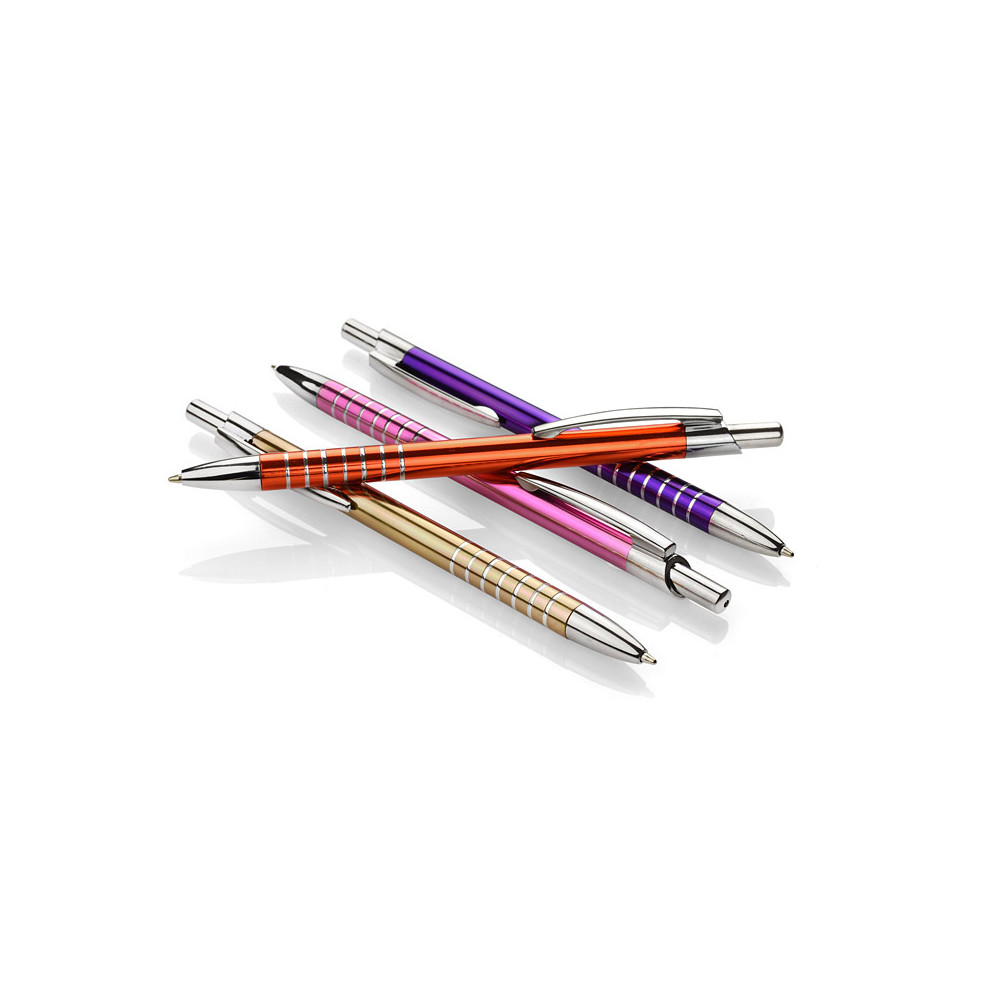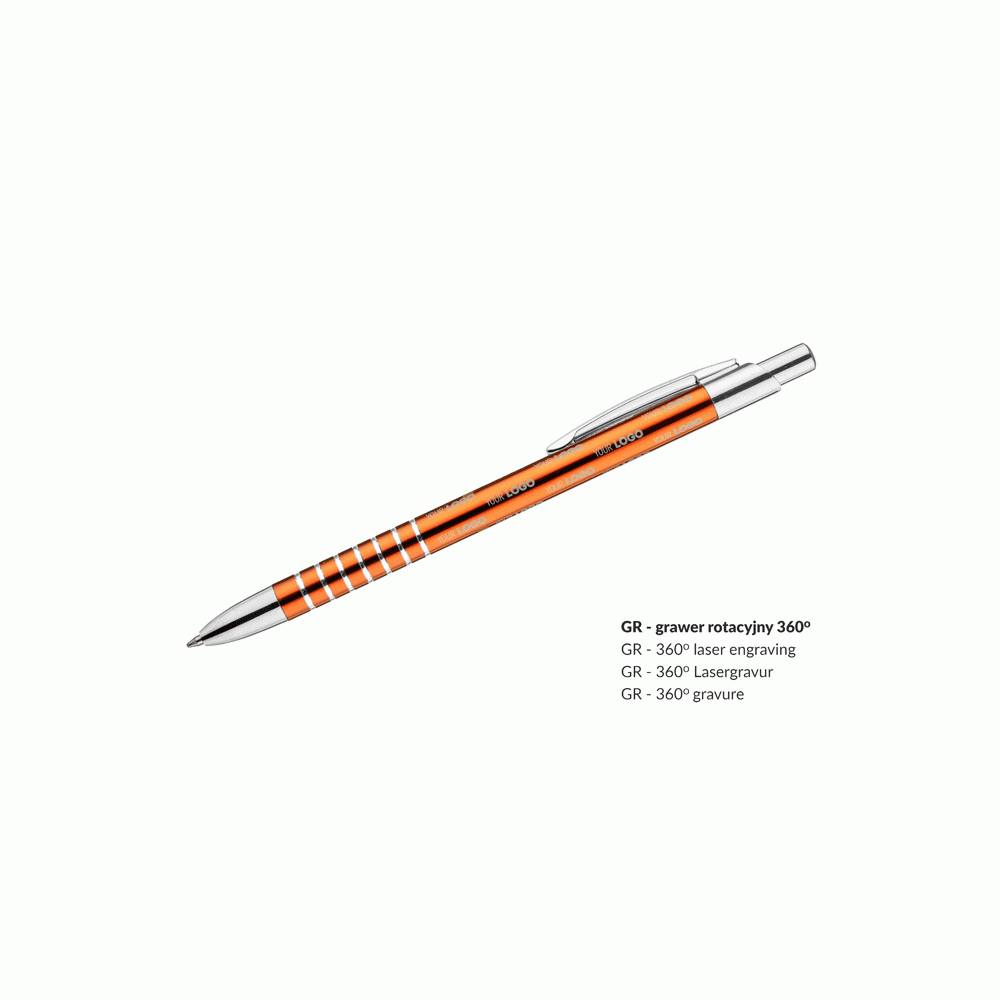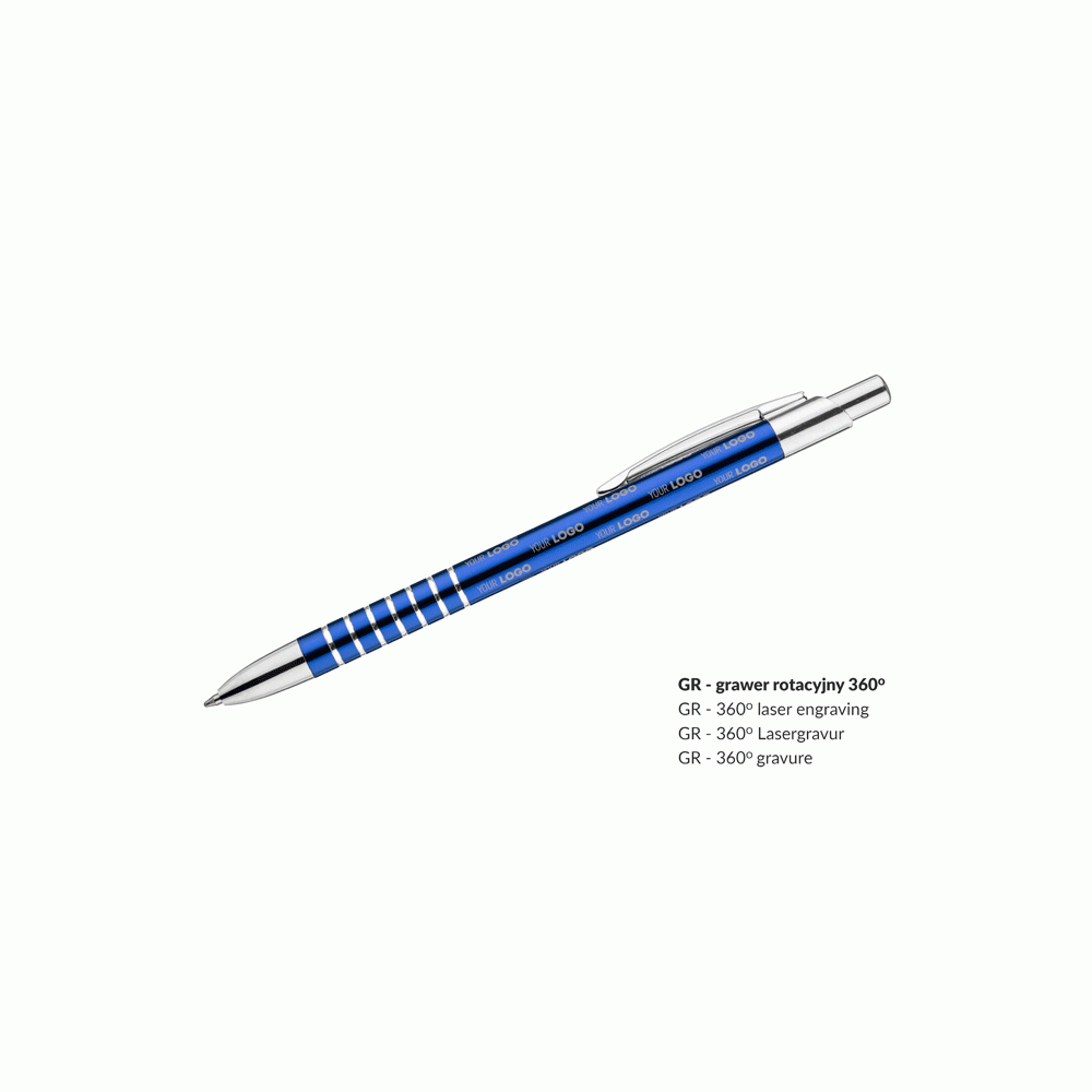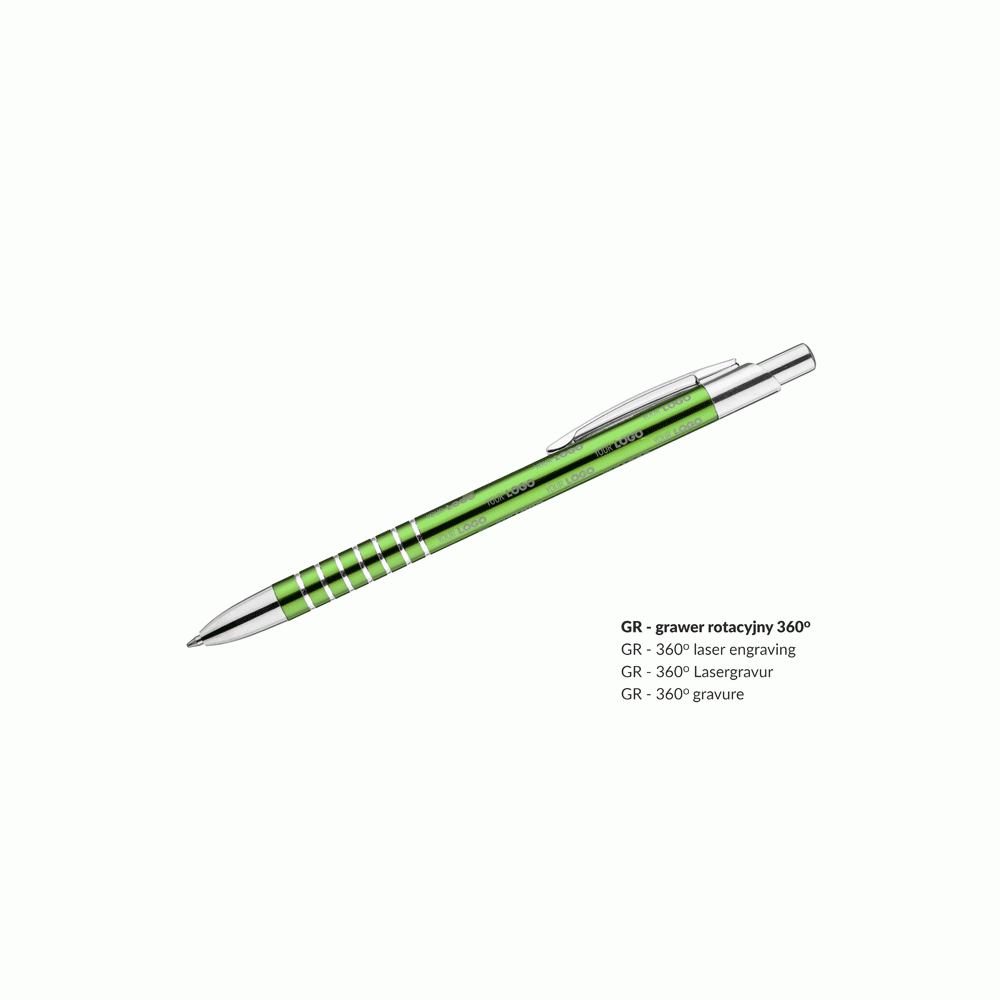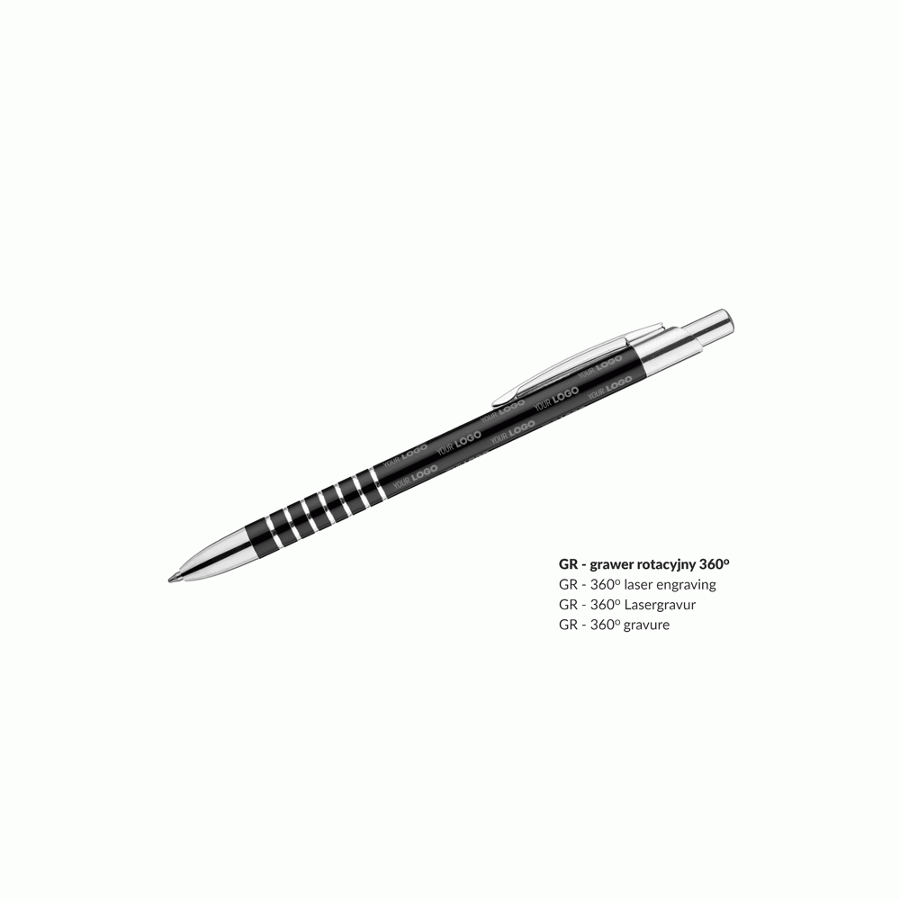 Prosty długopis wykonany z aluminium ozdobiony szerokimi ringami. Logo wygrawerujemy.