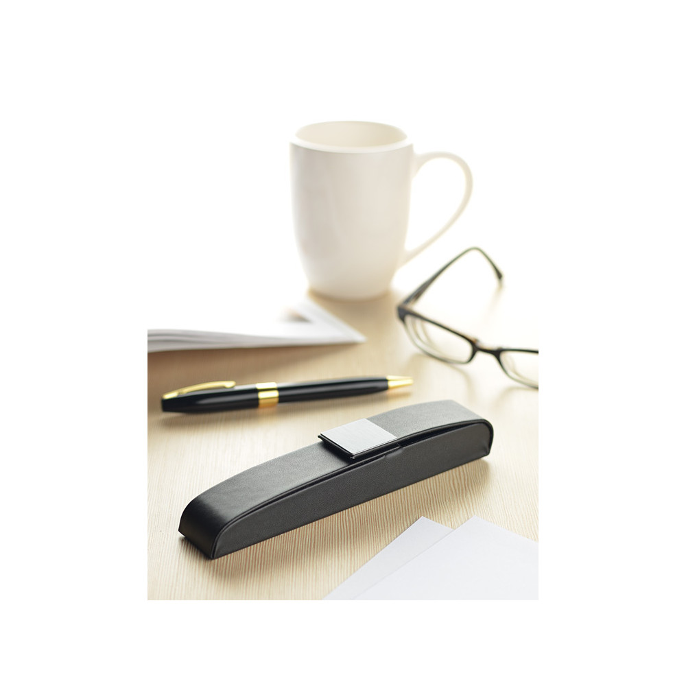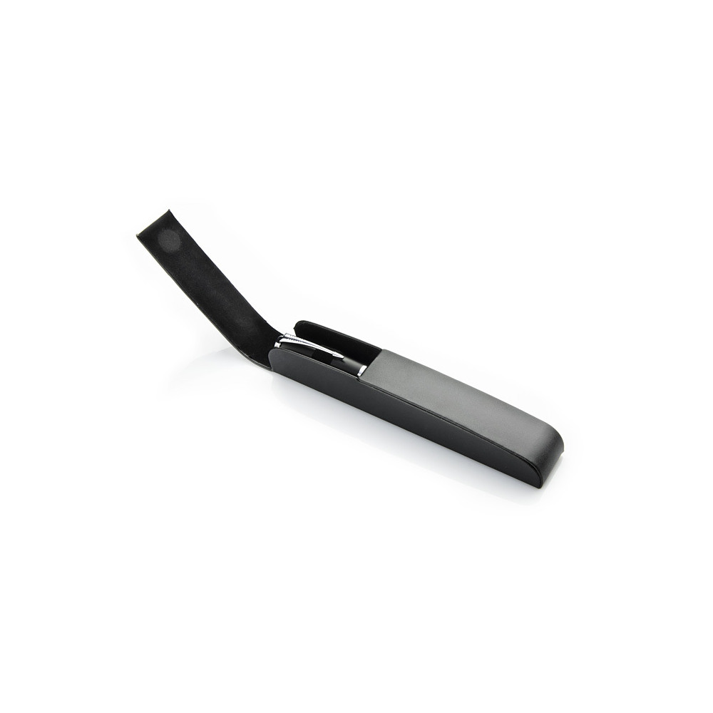 Etui na długopis wykonane z ekoskóry PU zamykane na magnes. Posiada szeroką blaszkę wykonaną ze szczotkowanego aluminium, dającą możliwość wykonania efektownego graweru. Pasuje do długopisów o wysokości od 122 do 148 mm.