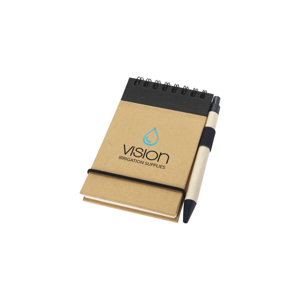 Notatnik wykonany z papieru z recyklingu, zawiera 40 kartek w linie oraz dopasowany długopis. Długopis pakowany oddzielnie.