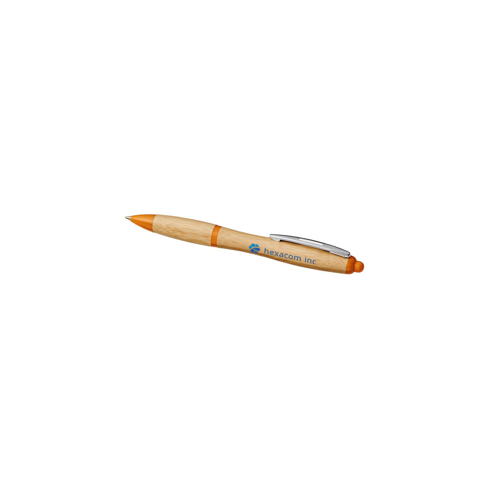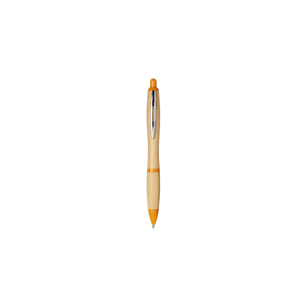 Przyjazny dla środowiska długopis automatyczny z korpusem wykonanym z bambusa, zaakcentowanym chromowanym klipsem i plastikowymi wykończeniami z plastiku ABS. Kolor materiału bambusowego może się różnić.