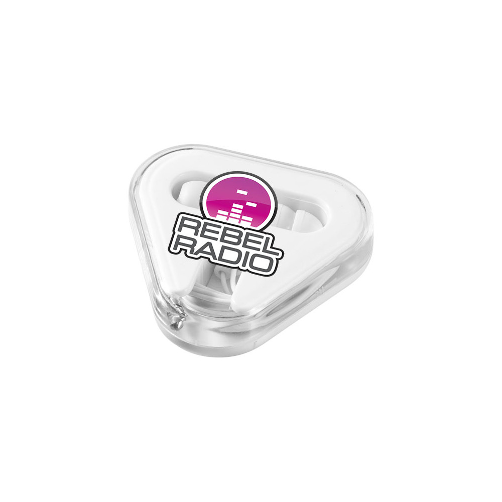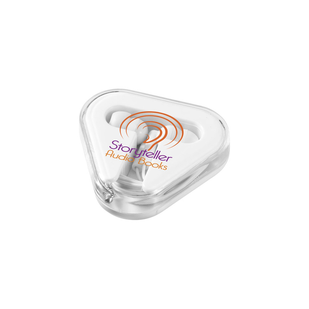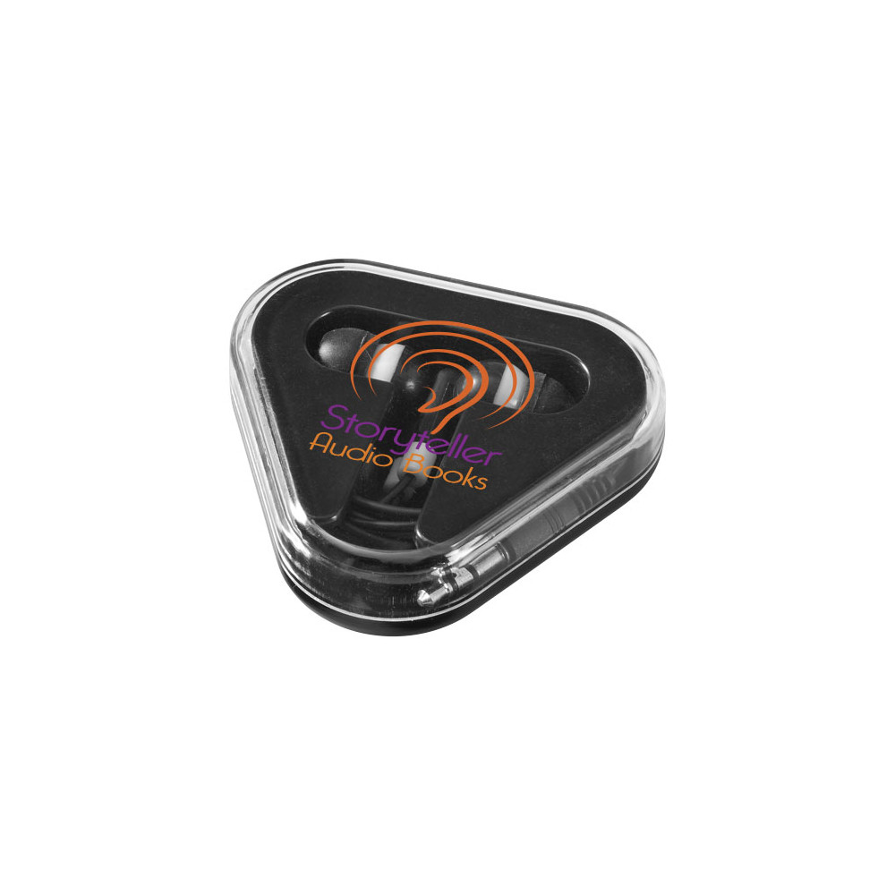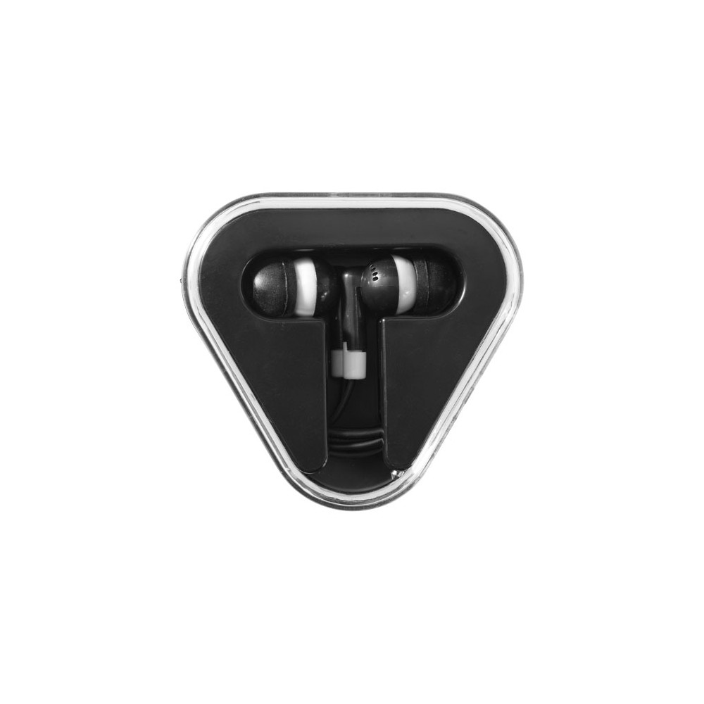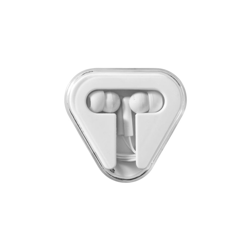 Plastikowe trójkątne etui z miejscem na schowanie kabla. Słuchawki kompatybilne z każdym standardowym urządzeniem z audio jack 3,5 mm.