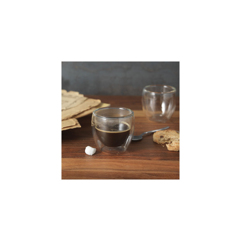 Zestaw do espresso zawiera dwie szklanki o pojemności 80 ml o podwójnych ściankach termoizolujących. Zestaw zapakowany w eleganckie pudełko upominkowe. W zestawie tabliczka grawerska.