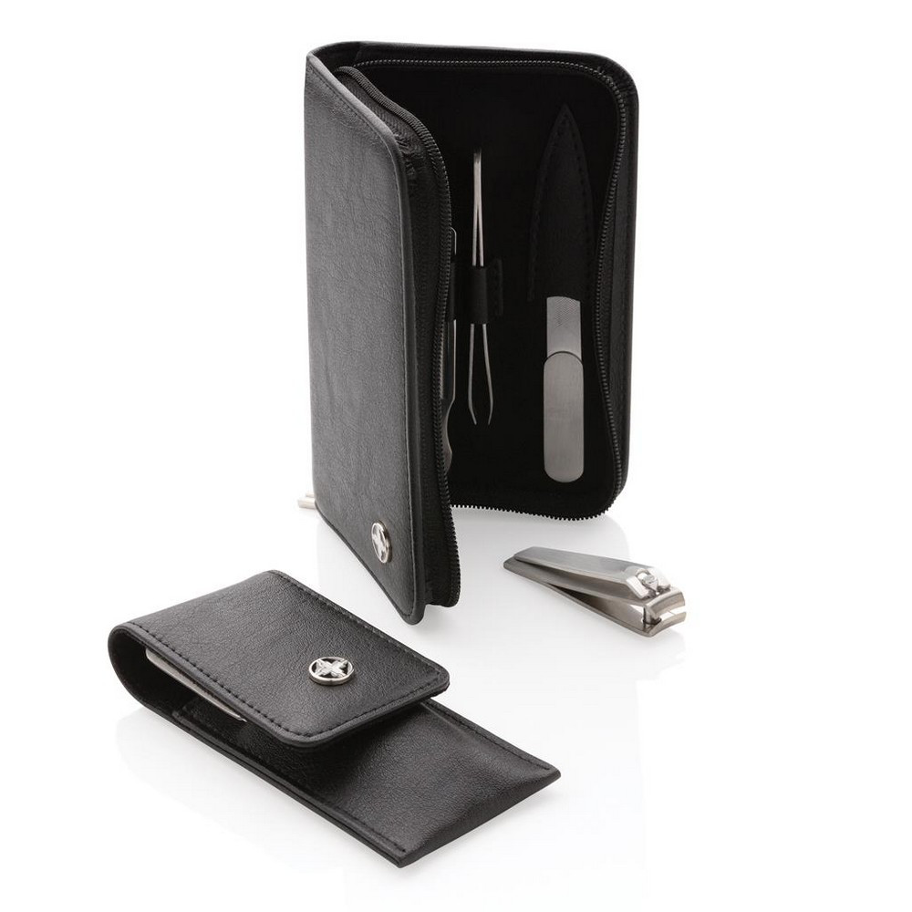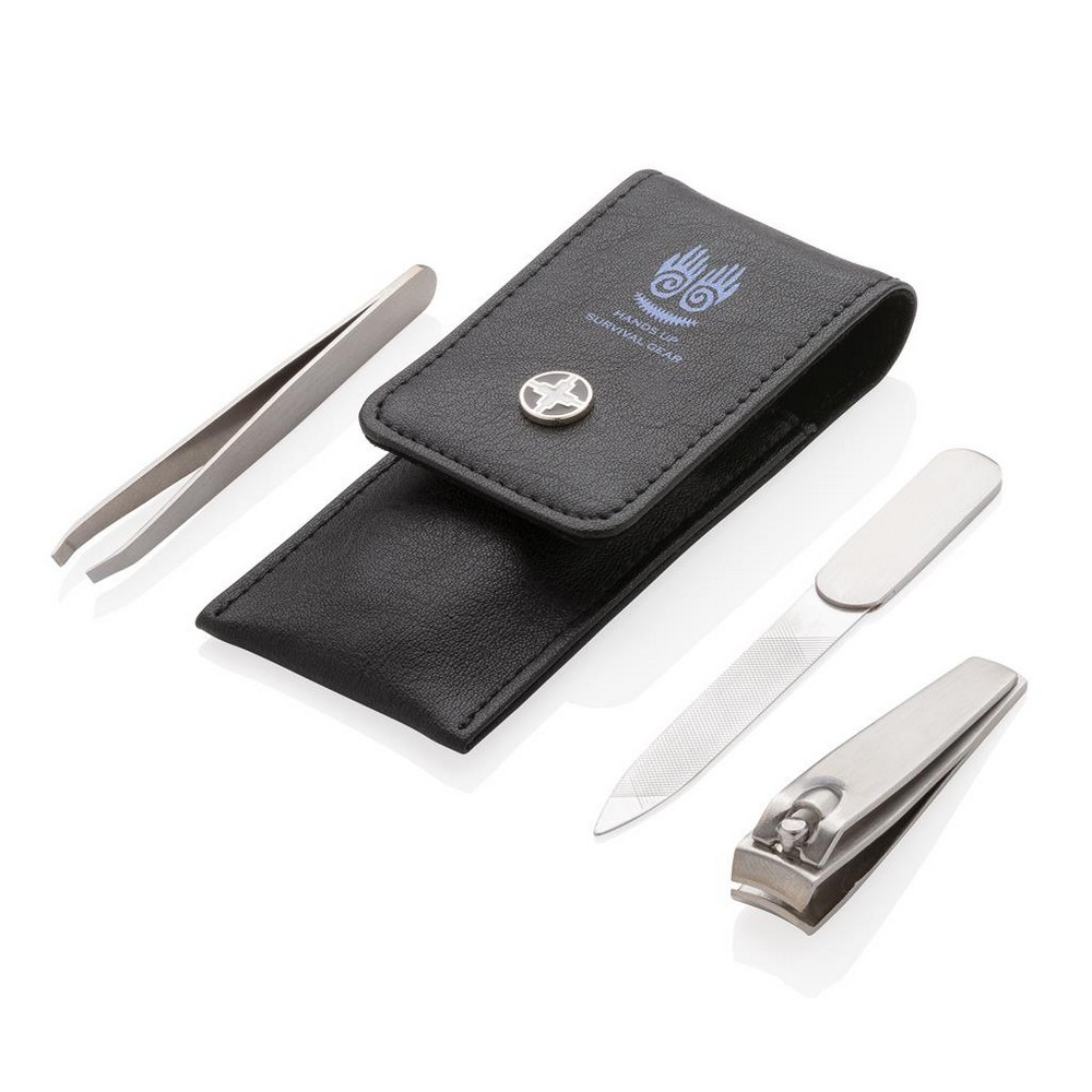 Zestaw do manicure 3 el., w komplecie: obcinacz, pilniczek do paznokci oraz pęseta, wykonane z matowej, szczotkowanej stali nierdzewnej, w ozdobnym etui z PU
