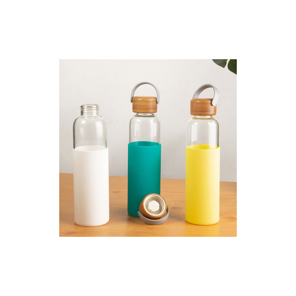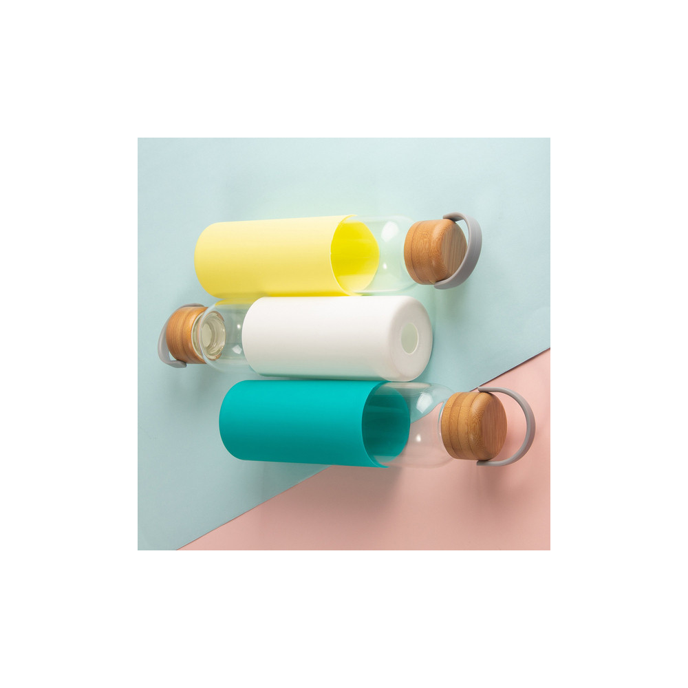 Stylowa butelka wykonana ze szkła borokrzemowego. Bambusowa, szczelna zakrętka z uchwytem i gładkie silikonowe etui to jej dodatkowe atuty. Zawsze warto pamiętać o właściwym nawodnieniu organizmu i mieć ze sobą butelkę ze świeżym sokiem, chłodną wodą czy innym ulubionym napojem. Pojemność 560 ml