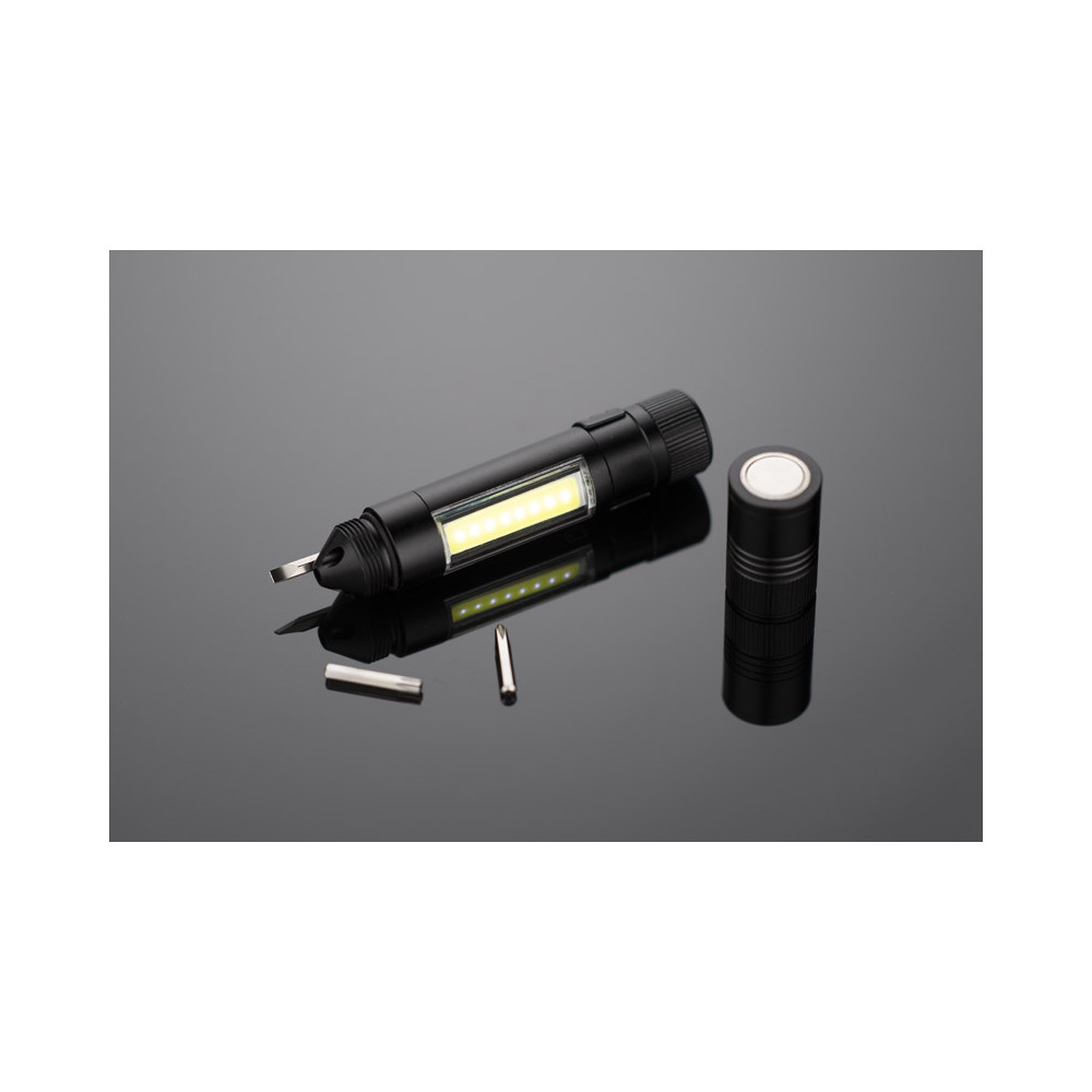 Latarka MAESTRO to gadżet wielofunkcyjny. Oprócz głównej funkcji, czyli lampki COB, w produkcie znajdziemy również zestaw trzech bitów: płaski, krzyżowy i gwiazdkowy. Latarka wyposażona jest w metalowy klip i magnes do mocowania.